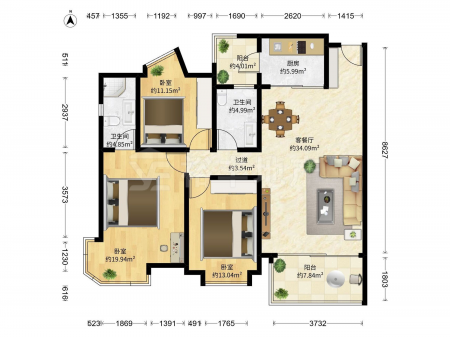 美林海岸花园 | 3室2厅 | 109.44 平米 | 南 | 毛坯 | 有电梯
